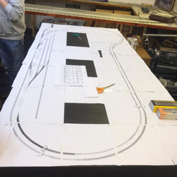 So this time, we have been setting out the plan for the lower level of the layout, pre printed sheets of A4 paper had been printed from the master plan, these were painstakingly stitched together by the team to give and overall impression of where everything is planned to go. There has already been one small modification due to a rouge support clashing with a track, but this has been addressed now.